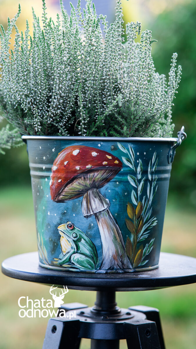 Czysta magia w ogrodzie już zaczyna się dziać. Już Srebrzą się między pajęczynami krople rosy i barwy się wyostrzają. Dlatego i u mnie ciut tej magii zagościło. Tym razem na wiadro – doniczkach z tematycznymi motywami.